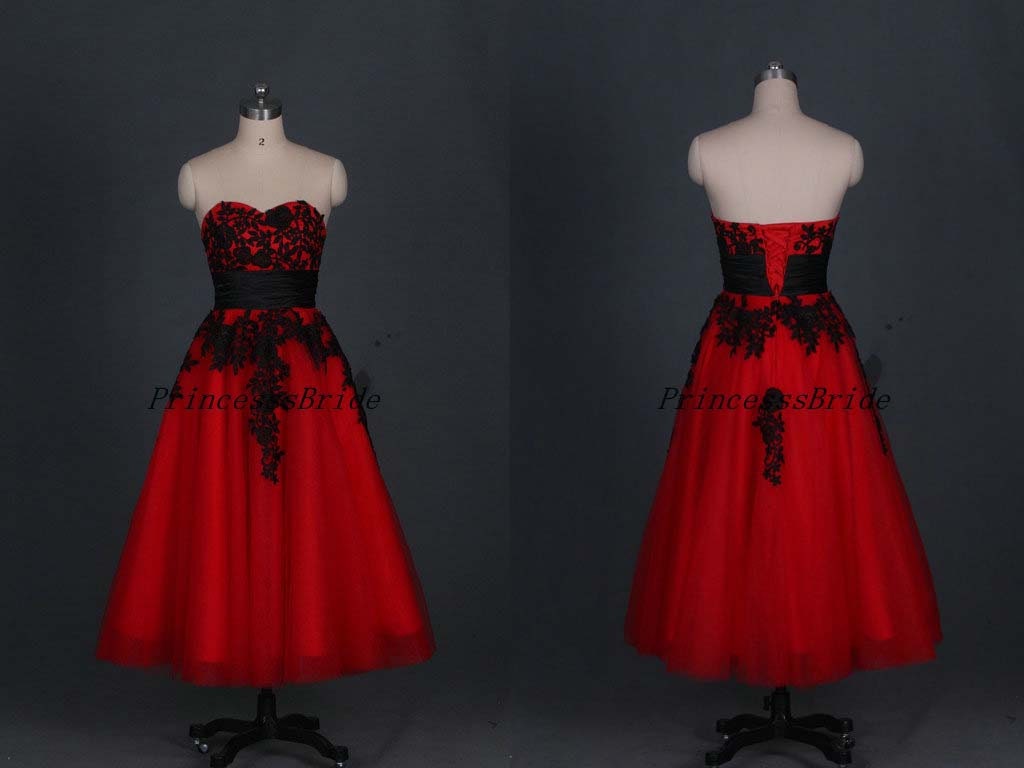 Latest Red Tulle Prom Dress With Black Lace Tea Length Dress